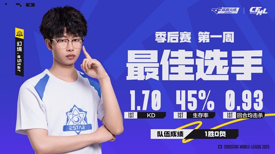 eStar击败白鲨.斗鱼称得上是季后赛第一周的爆冷之一。本场比赛eStar取胜的最大功臣非幻境莫属。本场比赛,幻境展现出了非常出色的双修能力,狙击和步枪的表现令人印象深刻。季后赛第一周,幻境场均KD达到1.70,排名联盟第一;生存率达到45.00%排名联盟第一,回合均击杀达到0.93排名联盟第一!凭借如此完美的发挥,幻境荣膺季后赛第一周最佳选手!