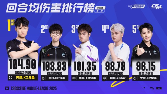 伤害榜上,天意荣获榜首。季后赛第一周,天意回合均伤达到惊人的104.90。墨白季后赛首战伤害拉满,他的回合均伤害达到103.83排名联盟第二。陌夏、晨晨和大梦分别以101.35、98.78和96.15的回合均伤害成功入选伤害榜。