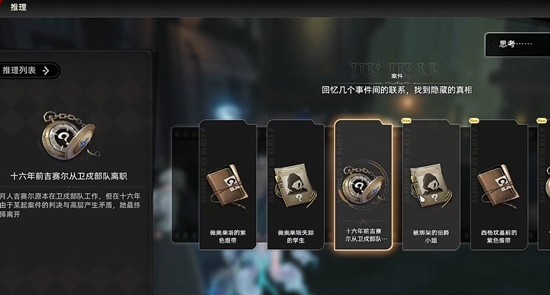 接着,将“两者的联系”与“十六年前的绑架案”结合,可推导出“可能是失踪的学生”这一关键信息。随后,将“十六年前的绑架案”与“十六年前的吉赛尔”进行关联,得出“十六年前的联络”线索。最终,通过整合所有信息,得出结论:“吉赛尔是本次绑架案的主谋”。确认推理无误后,提交线索即可完成任务。