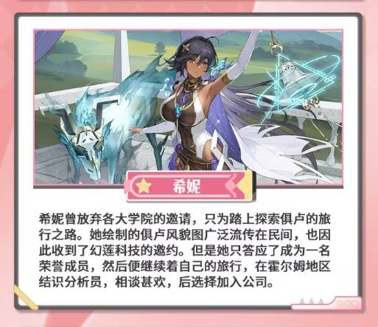 希妮是一位才华横溢的绘师,她放弃了各大学院的邀请,只为踏上探索俱乐部的旅行之路。她绘制的俱乐部风貌图广泛流传在民间,也因此收到了幻莲科技的邀约。但她只答应了成为一名荣誉成员,然后便继续着自己的旅行,在霍尔姆地区结识了分析员,相谈甚欢,后选择加入公司。