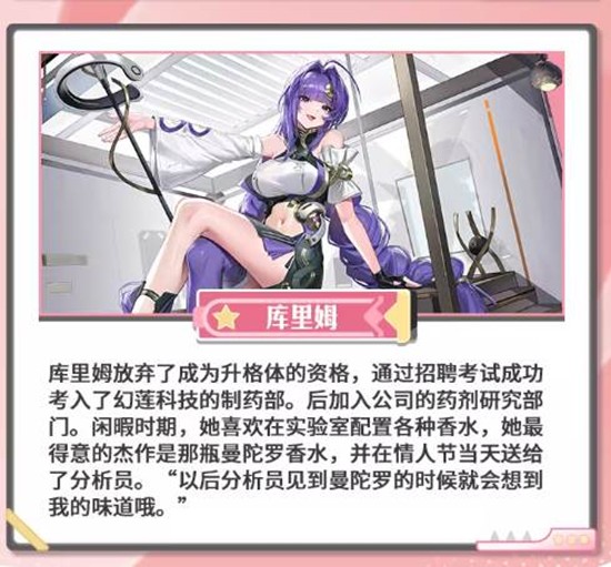 库里姆放弃了成为升格体的资格,通过招聘考试成功考入了幻莲科技的制药部。后加入公司的药剂研究部门。闲暇时期,她喜欢在实验室配置各种香水,她最得意的杰作是那瓶曼陀罗香水,并在情人节当天送给了分析员。“以后分析员见到曼陀罗的时候就会想到我的味道哦。”