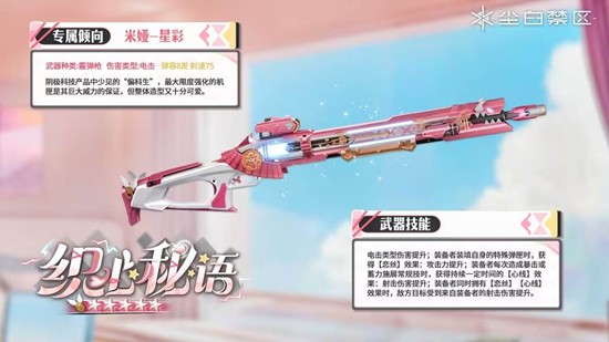 霰弹枪,装备者装填自身的特殊弹匣时,获得【恋丝】效果:攻击力提升;射速75,装备者每次造成暴击或蓄力施展常规技时,获得持续一定时间的【心线】效果:射击伤害提升;装备者同时拥有【恋丝】【心线】效果时,敌方目标受到来自装备者的射击伤害提升。