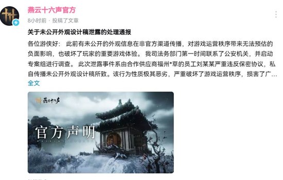 燕云十六声项目组对于未公开外观设计稿的泄露事件采取了严肃的态度,并已公布处理措施。项目组表示,将坚决保留通过法律途径追究任何组织或个人针对《燕云十六声》项目侵权行为责任的权利,并将持续严厉处置各种泄密行为。