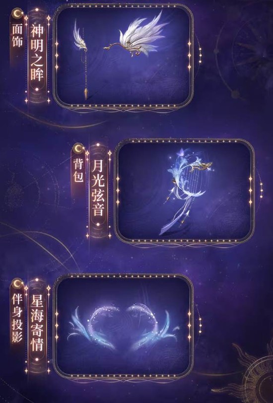 女性时装以银河碎屑点缀长发,月华为纱,潮汐为裙摆,当圣殿之门洞开星海,她携永夜的温柔降临,守护每一寸静谧。男性时装则裹白昼光辉织成战铠,燃日冕为发,刻烈焰为图腾,黄金神扉映亮炽土时,他赋予万物磅礴光明,践行每一句承诺。