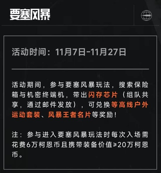 注意:参与进入要塞风暴玩法时每次入场需花费6万柯恩币且携带装备价值≥20万柯恩币。