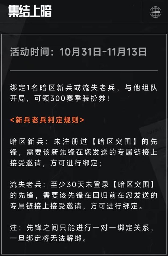 为了增强团队的凝聚力,游戏特别推出了“集结上暗”活动。绑定1名暗区新兵或流失老兵,与他组队开局,即可领取300赛季装扮券。新兵老兵判定规则如下:
