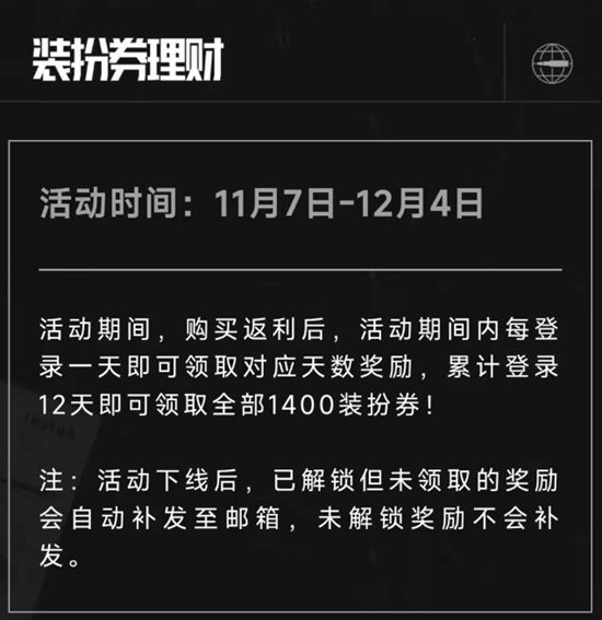 活动期间,购买返利后,活动期间内每登录一天即可领取对应天数奖励,累计登录12天即可领取全部1400装扮券!