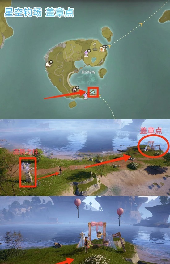 星空钓场——传送后向后转,沿着小路走,盖章点在水边也就是路的尽头。最近传送点:星空钓场旁(小道)