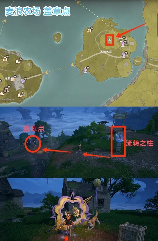 麦浪农场——传送后向后转,往右下方平台漂浮过去,经过一个气流柱,盖章点在石屋前。最近传送点:麦浪农场石树顶