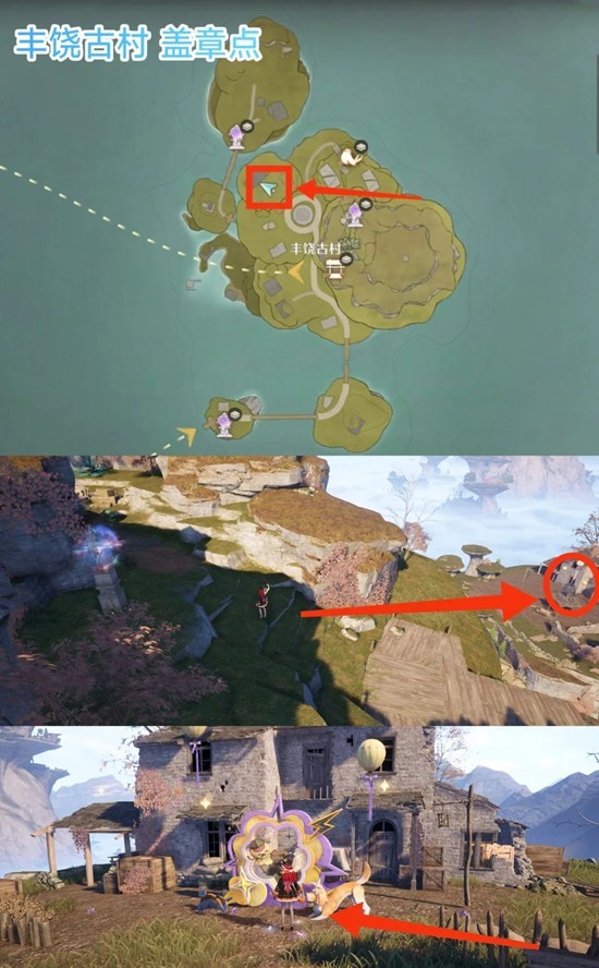 丰饶古村——传送后向右后方看,能看到下面有矮一层的石树,盖章点就在下方的石树上。最近传送点:石碑地