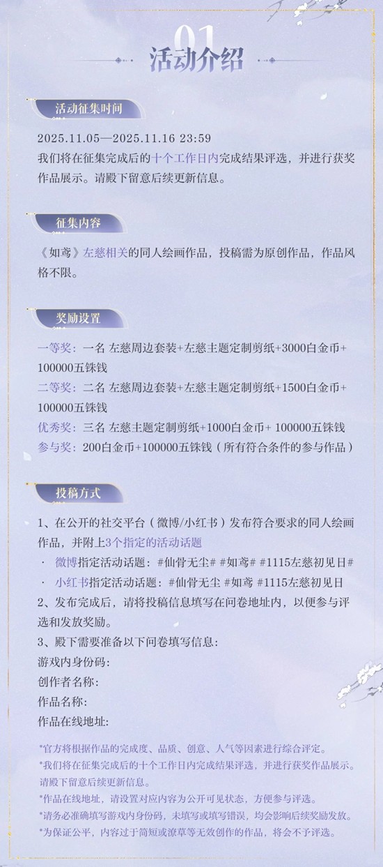 如鸢左慈初见日同人绘画作品二创征集活动现已开启~在公开的社交平台(微博/小红书)发布符合要求的同人绘画作品,附上3个指定的活动话题,并在投稿作品登记问卷内进行投稿登记。和他的初见日即将到来,“仙骨无尘”主题二创活动现已开启。拿起手中的画笔,绘制独一无二的记忆吧~
