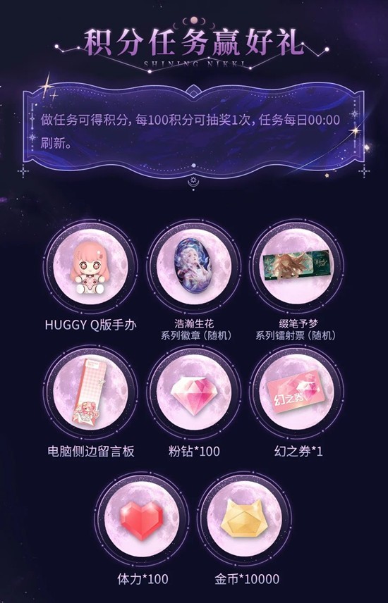 完成任务攒积分,消耗积分即可参与抽奖,抽取粉钻、HUGGY手办、系列周边等!