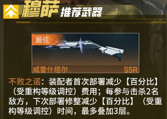 威雷什塔尔是镭明闪击穆萨的首选武器。这把武器的被动效果与穆萨的作战机制高度契合,能够在首次部署时直接减少费用,减轻前期压力,具体减免费用的比例会随着武器重构等级提升而增加。更关键的是,每当穆萨参与击杀两名敌人后,下一次部署的休整时间就会缩短,最多可叠加三层。这一特性让穆萨能够频繁进场,持续施压,极大增强了她在多波次战斗中的节奏掌控能力。