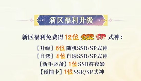 新区福利免费得12位SSR/SP式神,包括6位随机SSR/SP式神、4位自选SSR/SP式神、1位新手必备SSR辉夜姬以及1位通过预抽卡获得的SSR/SP式神,让玩家在新区的冒险之旅更加精彩。
