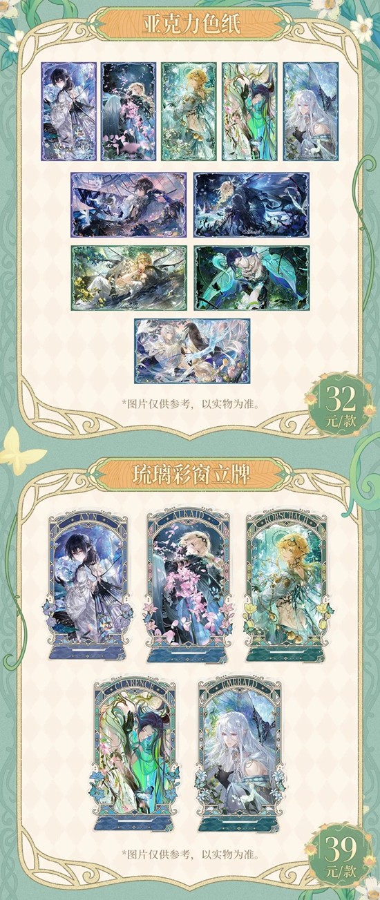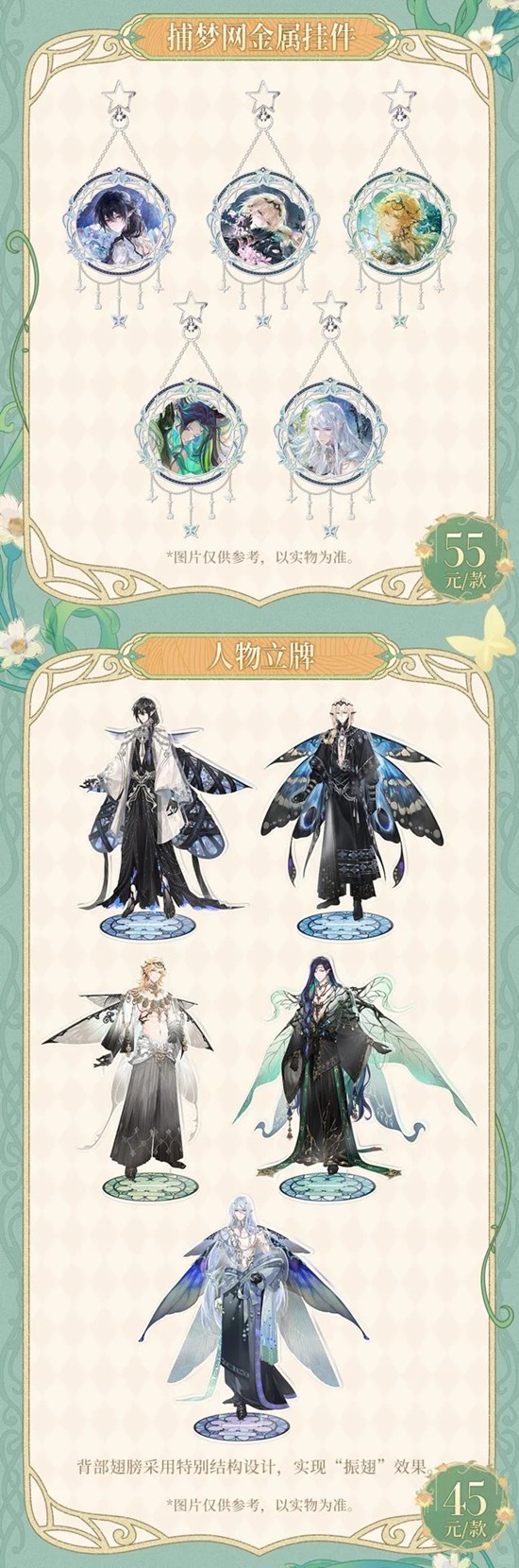 >「若梦熄」系列:异形小卡、金属挂件、亚克力色纸、琉璃彩窗立牌、人物立牌、木质立体摆件、旋转立牌、风铃、一拉就飞挂件