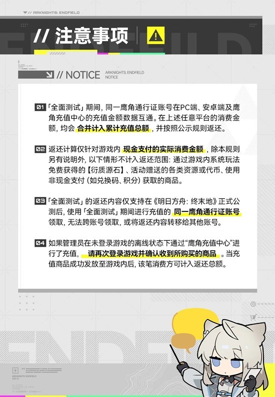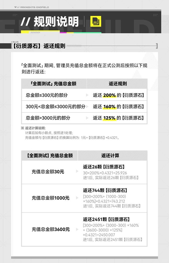 以上就是《明日方舟:终末地》「全面测试」限量计费删档测试充值返还规则的全部内容了,更多游戏资讯,攻略内容敬请关注切游网,您的支持是我们努力的动力!