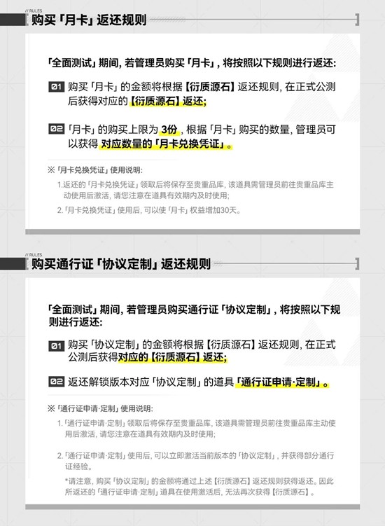 「全面测试」期间,若管理员购买「月卡」,将按照以下规则进行返还: