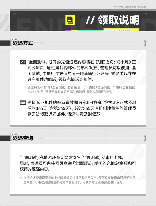 「全面测试」期间的充值返还内容将在《明日方舟:终末地》正式公测后,通过游戏内邮件的形式发放。管理员可以使用「全面测试」中进行过充值的同一鹰角通行证账号,登录游戏并在开启邮件功能后,领取充值返还邮件。
