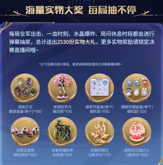 每局比赛的全军出击、一血时刻、水晶爆炸、局间休息时段都会进行弹幕抽奖,总计送出2530份实物大礼,包括无限王者团随机周边、王者荣耀机甲孙膑音300、孙膑妖精王Q版手办170、武则天幻海之心Q版手办200等。
