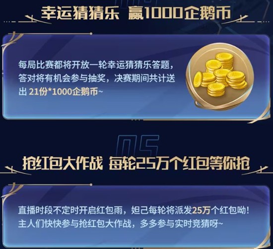 每局比赛都将开放一轮幸运猜猜乐答题,答对将有机会参与抽奖,决赛期间共计送出21份*1000企鹅币。