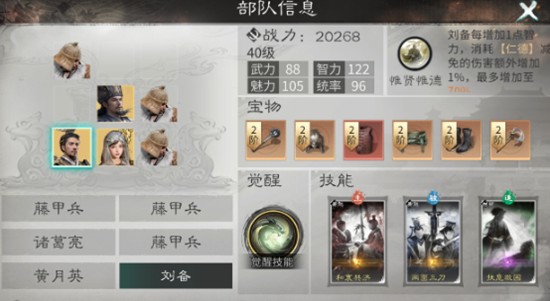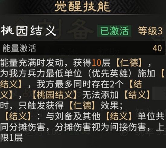 觉醒技能进一步强化了刘备的团队支援能力。在战斗中,该技能可快速叠加多层仁德,并将其赋予兵力最低的己方单位,触发“结义”效果。结义状态下,目标将分担部分所受伤害,相当于为其提供了一层额外的生存屏障。这一机制特别适合保护队伍中的高输出脆皮角色,如诸葛亮或黄月英,使他们在关键时刻不至于被集火秒杀。同时,觉醒技能解决了仁德层数积累较慢的问题,让刘备在战斗前期就能发挥关键作用。