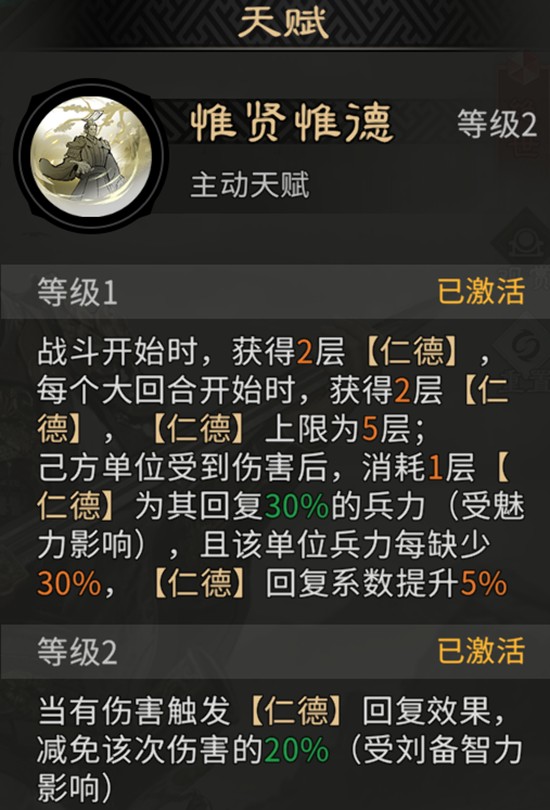 仁德是刘备的核心技能,在战斗中持续发挥作用。每当己方单位受到伤害时,会消耗一层仁德效果,同时为该单位恢复一定兵力与生命值。这一机制使得刘备在持久战中具备极强的续航能力。当该技能升至2级时,还能为全队提供20%的减伤效果,显著提升整体生存能力。在面对多段伤害或AOE频繁的敌人时,这一减伤配合治疗能有效延缓队伍崩盘节奏,为反击争取宝贵时间。