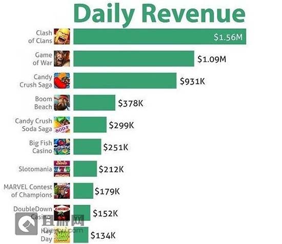 数据显示,由芬兰开发商Supercell制作的《部落战争》每天的收入达到156万美元(约合968万元),其次是策略类的《战争游戏》(Game of War)和三消类的《糖果传奇》(Candy Crush Saga),后两者日收入均在100万美元(约合600万元)左右。