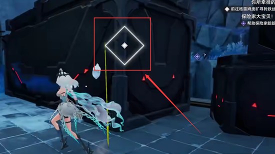 接下来的任务指引将玩家引向格雷姆废矿底层。通过传送点抵达后,需深入矿洞内部,在右侧废墟区域仔细搜寻。此处环境较为昏暗,注意观察集装箱上方是否有白色交互提示。当靠近正确位置时,界面会出现“拾取铁丝”的操作选项,确认后即可完成此阶段目标。