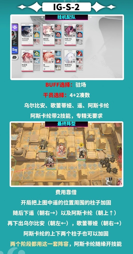 费用靠借开局把上图中遥的位置周围的柱子加固随后下遥(朝右→)以及阿斯卡纶(朝上↑)再下出乌尔比安(朝左←),歌蕾蒂娅(朝右→)