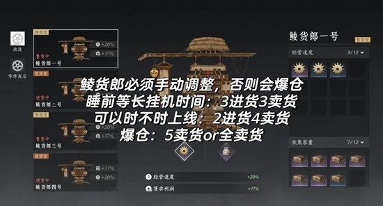 睡前等长挂机时间:3进货3卖货当库存到1500左右:2进货4卖货(需要时不时上线看看库存,当库存到两位数调整为3进货3卖货)