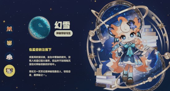 幻雪是一位神秘的九尾狐,身份为神秘学研习师,行踪莫测,随身携带记录宇宙奥秘的笔记本。他对各种未解现象有深入研究,每当有人提出疑问,他总能耐心解答,并展现出强烈的好奇心。在星布谷地的剧情推进中,幻雪可能引导玩家接触隐藏任务、解锁特殊事件或揭开地图背后的秘密,为游戏增添奇幻色彩与探索深度。