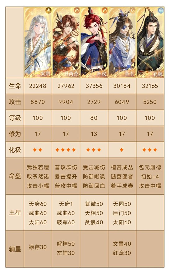 由于一星董奉生存压力大,并且安期被属性克制很容易站不住,上孔融提高生存能力