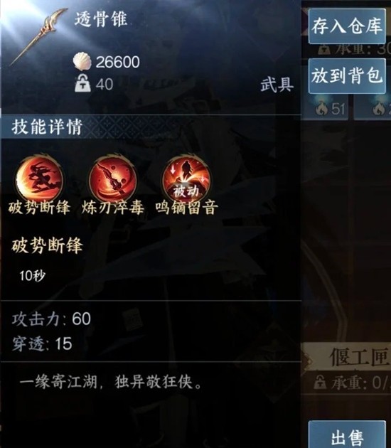 透骨锥 主要是用于打架,装备差不多的情况下先手基本就能赢(炼刃-破势-绝技-一键)。