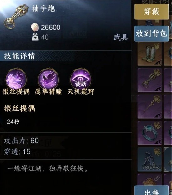 袖手炮 则是我个人认为非常适合不想打架的玩家的,这个武器带的技能鹰隼猎瞳可以帮忙探测周围有没有人,人在哪个方向,一旦提前探测到,就可以直接反方向开跑了(我就社恐怎么了)。