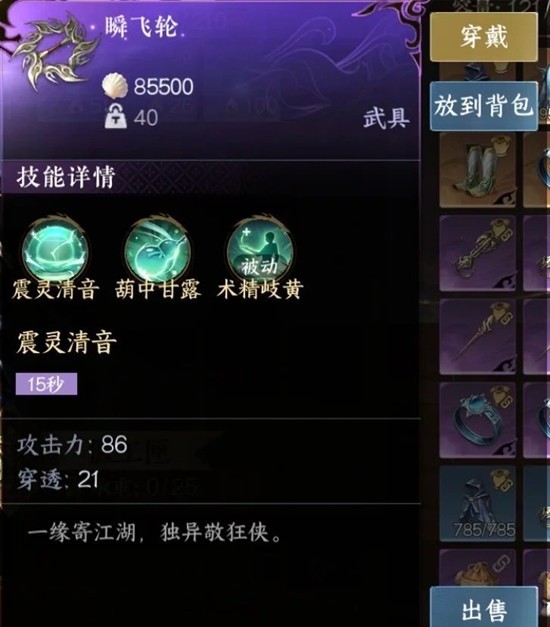 柳叶飞刀 打怪神器(曾经靠这个和旁边的窖池单刷了险境的黑天),不过在凡境的保活方面没什么用(怪尴尬的哈)。
