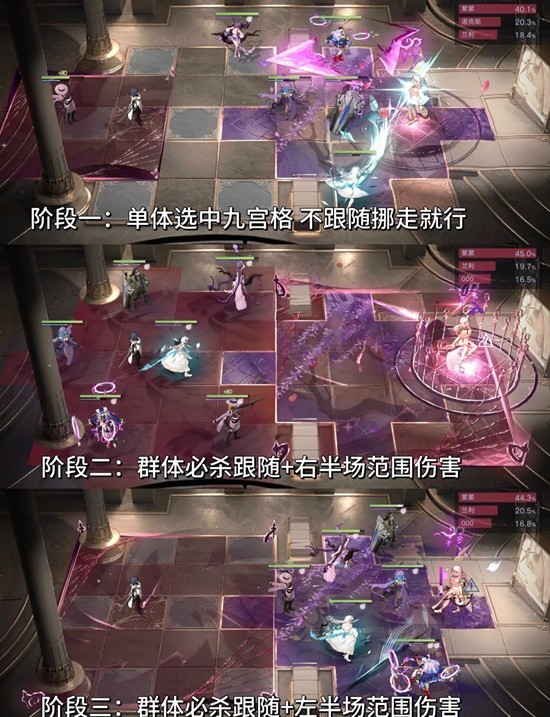 非常傻瓜的操作方式就是先全体踩左边特别颜色的地板 然后第一波伤害砸下来之后马上全体移到右边特别颜色的地板 然后就会发现砸不死 可以接下来就可以破核框框输出 但是我伤害不咋高 就要反复这样走位几次 这三种伤害是循环出现的 注意步数就好