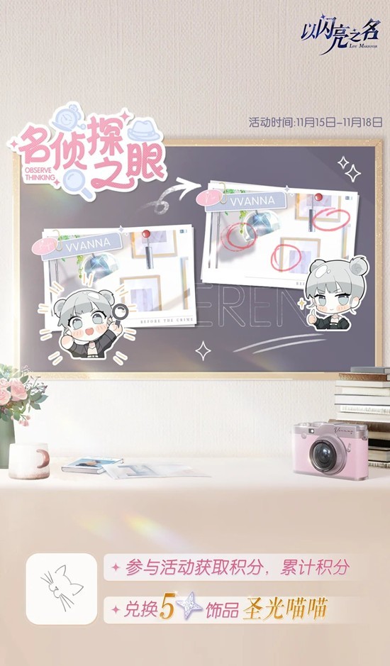 累积侦探积分,可以获取五星饰品【圣光喵喵】、拍照萌拍【灵感爆发】、钻石*30、潮流色卡*9及多种材料道具奖励!