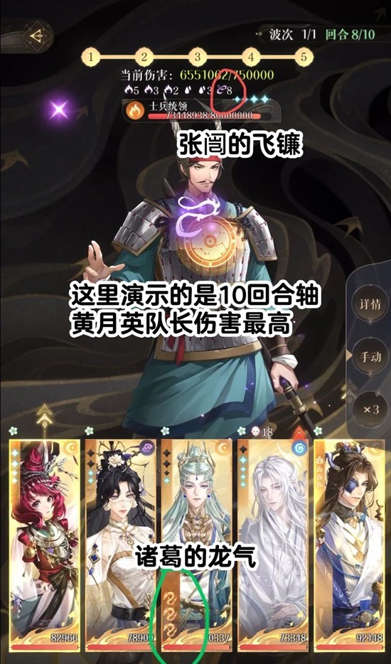 正常黄月英队长伤害是最高的,dot队提前开大吃不到橙星回能,但是需要速杀boss的和特殊机制除外(例如本期白鹄,就诸葛亮队长更好,根据关卡选队长)
