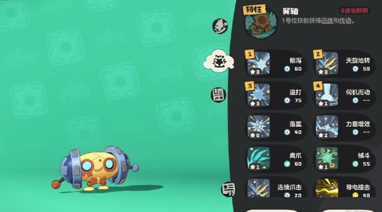 进阶后的螺旋帕帕将获得翼轴特性,使其一号位技能自动附带“迅捷”与“传动”效果,极大提升了技能释放节奏。它可携带的核心技能包括倾泻、天旋地转、追打、伺机而动、落星、力量增效、鹰爪、械斗、连续爪击和导电撞击。其中力量增效可在短时间内提升100%物理攻击,配合后续的连续爪击或械斗类高频率技能,能打出成倍伤害。齿轮扭矩作为四号位技能也非常关键,每次切换位置都能使技能威力增加30点,鼓励玩家灵活运用站位机制。