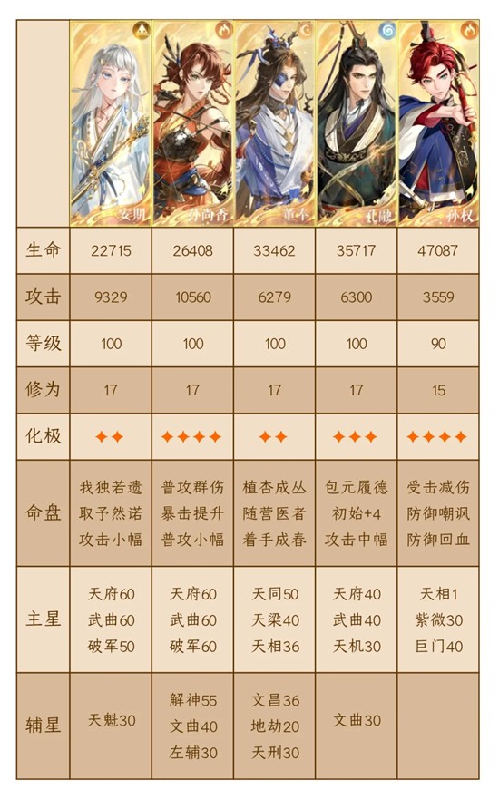 董奉孙权孔融这堆辅星,除了董奉刚需文昌回血,其他都是有什么减抗,免伤都往上放,活着!才是英雄!