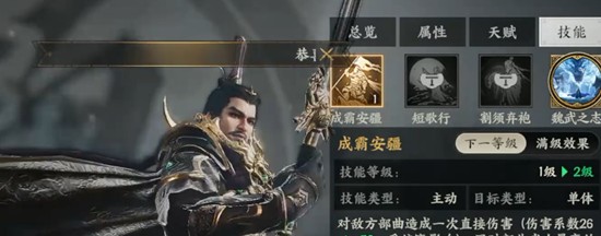 这是曹操的核心技能,在实战中拥有双重效果:首先会对敌方单体目标造成一定量的伤害,随后为我方武力最高的武将提升25%的技能伤害,持续两回合。该增益效果可以叠加,意味着在连续作战中曹操的作用会逐步放大。尤其是在配合高爆发武将如吕布时,这一技能能够显著放大输出能力,使主力输出在短时间内打出成吨伤害。同时,由于该技能也间接提升了谋略类武将的技能伤害,因此在搭配特定谋士阵容时同样具备应用空间。
