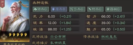 于吉在三国乱世霸王中的定位偏向辅助与控制,其武力值偏低,难以承担主力输出任务,智力属性尚可但在面对顶级谋士时略显不足。真正让他脱颖而出的是高达1.84的统率成长值,这一数据保障了他在战场上的生存能力与稳定性。同时,他拥有30%的“仙人”特性,使得他在兵种适配上几乎没有限制,能够灵活搭配骑兵、步兵或弓兵等多种阵容,适应不同对战场景的需求。