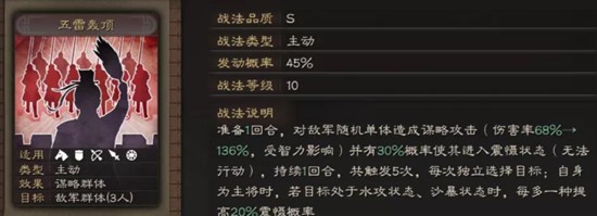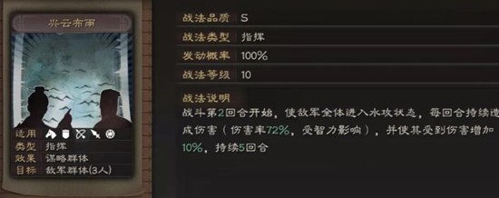 于吉的核心战法“兴云布雨”是其 gameplay 的核心所在。该技能可对敌方全体施加“水攻”状态,并附加一定的法术伤害。除了稳定的群体伤害外,该战法更关键的是其附带的控制效果,能有效打乱敌方输出节奏,为己方创造有利的输出环境。尤其是在配合张角时,水雷联动可触发额外的异常状态叠加,大幅提升控制覆盖率,形成持续压制的局面,是群雄体系中控场链的重要一环。