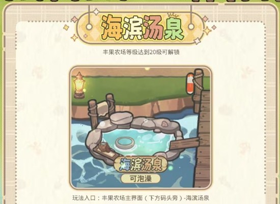 丰果农场等级达到20级可解锁。玩家可以邀请消耗了一定体力的搭档来海滨汤泉处享受汤泉,帮助他们恢复体力,在享受汤泉时,选择不同的入浴剂可获得不同的效果,如加速体力恢复、提升工作效率等。