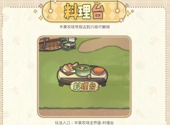 丰果农场等级达到25级可解锁,玩家可以利用采摘的新鲜蔬菜和果实,动手制作各种佳肴。升级料理台可解锁菜谱,根据菜谱提示提交材料,可提升研制进度。