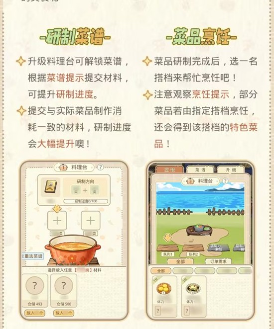 菜品研制完成后,选择一名搭档来帮忙烹饪,部分菜品若由指定搭档烹饪,研制进度会大幅提升。