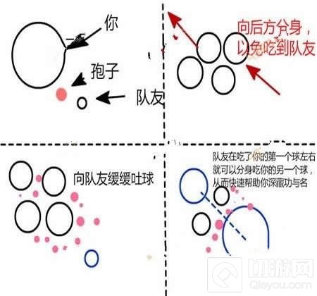 选择与队友反方向吐球,可以让自己的体积变小,同时不至于误食队友,这样队友就可以通过你的孢子迅速变大。