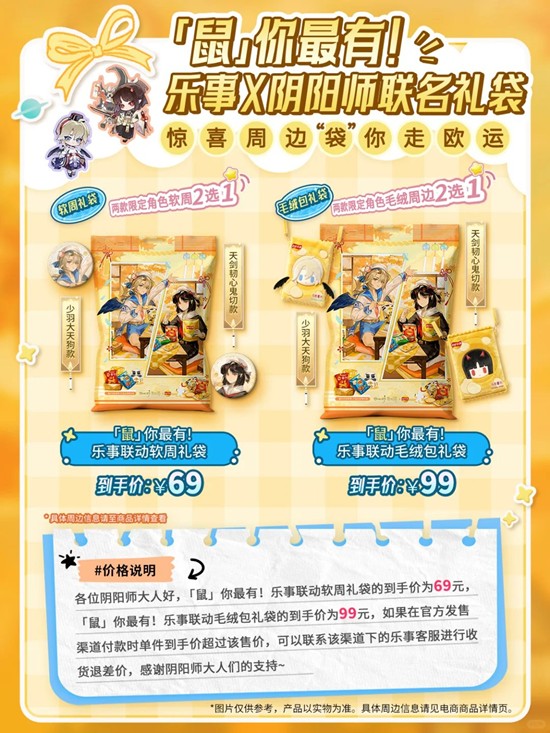 各位阴阳师大人好,「鼠」你最有!乐事联动软周礼袋的到手价为69元,「鼠」你最有!乐事联动毛绒包礼袋的到手价为99元,如果在官方发售渠道付款时单件到手价超过该售价,可以联系该渠道下的乐事客服进行收货退差价,感谢阴阳师大人们的支持~