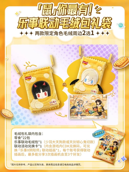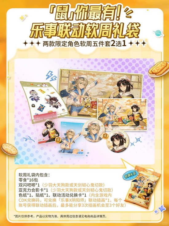 零食*16包,双闪吧唧*1(少羽大天狗款或天剑韧心鬼切款),亚克力合影卡*1(少羽大天狗款或天剑韧心鬼切款),色纸*1、贴纸*1、联动活动兑换卡*1(内含游戏内CDK兑换码,可兑换「乐事X阴阳师」联动插画*1,每个账号获得联动插画后,最多能分享3次插画机会至3个好友