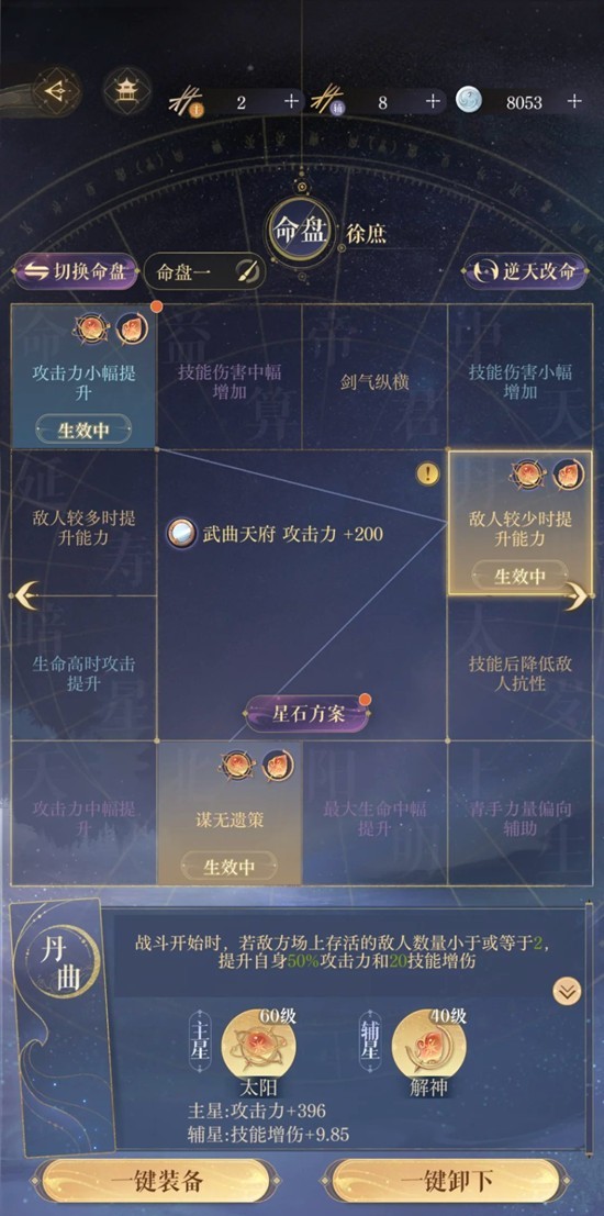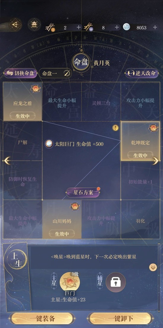 命盘如图黄月英只必备乾坤不能有羽化,其他盘有董奉不生效;主c攻击6900-7300